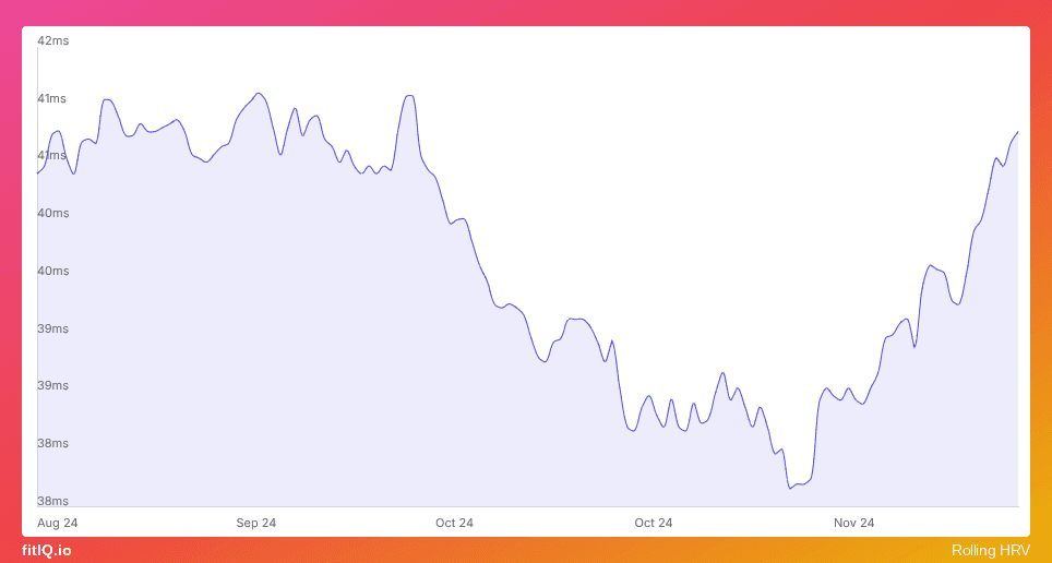 Rolling HRV: After a dip post-October, my HRV has been steadily increasing. (See the graph below for the details.)