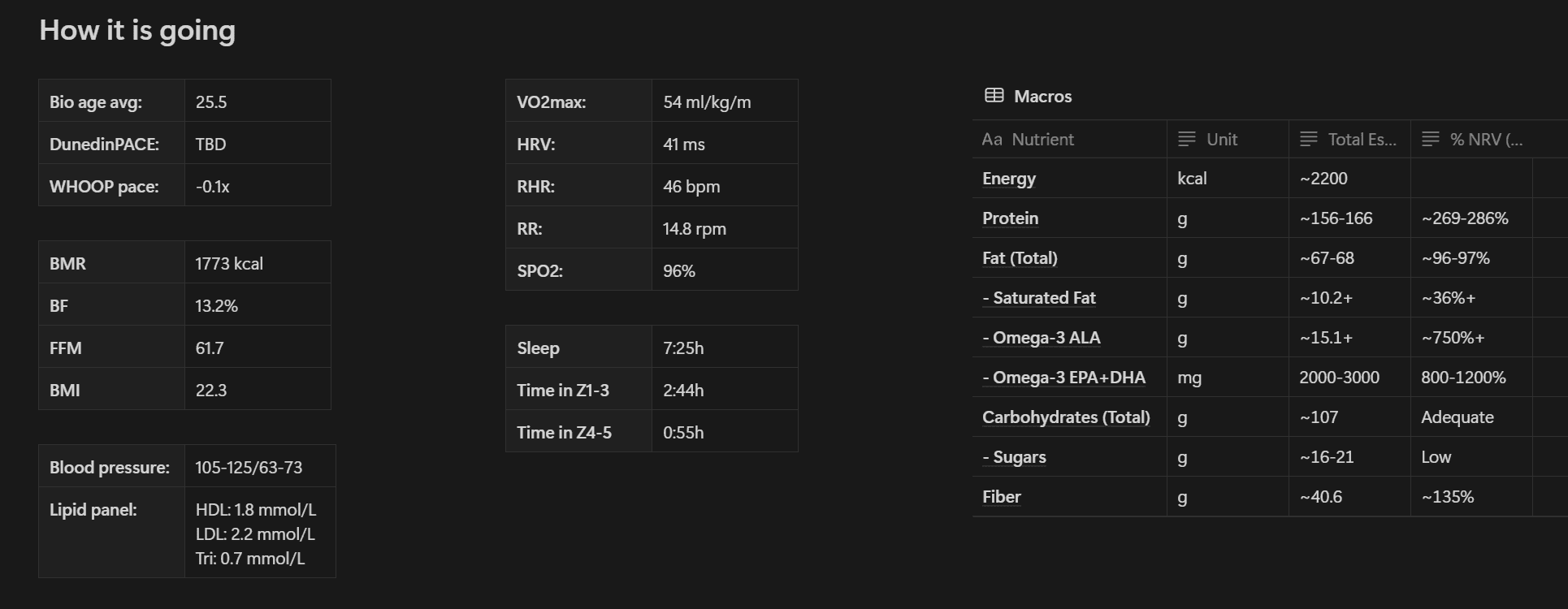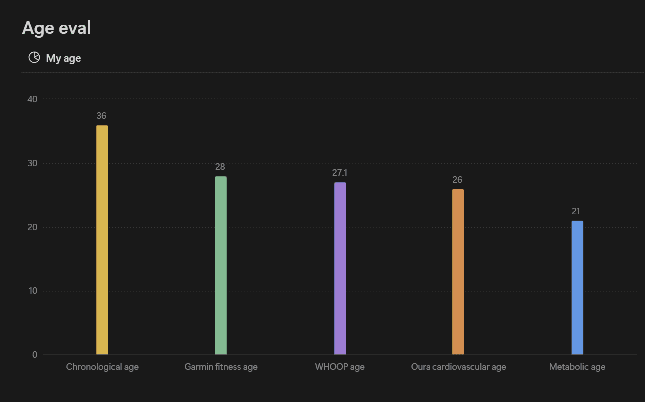 I'm focused on getting back into a rhythm now, prepping for my first triathlon (olympic), later this year. And with that, I started designing my training and nutrition with LLMs and documenting a bit more on Notion. I use quite a few wearables (you could call it a hobby) and here's an interesting comparison of my various age evaluations: