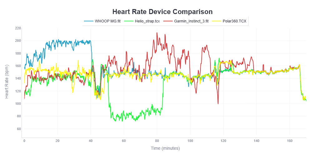 TL;DR: Raced a tri with WHOOP, Polar360, Helio strap, Garmin Instinct 3, and Oura Ring 4. Polar was the most reliable, WHOOP decent but spiky in swim, Helio finicky about placement, Garmin surprisingly messy, Oura useless for sport.